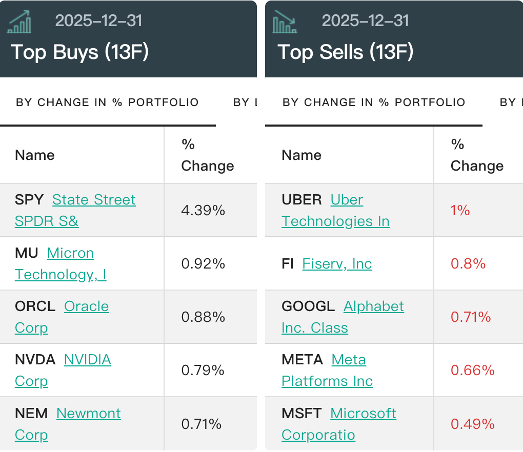 在具体操作上,2025年第四季度,桥水大幅增持标普500ETF-SPDR(SPY)189万股;在科技领域,桥水增持英伟达约135.5万股,增持亚马逊82.3万股,增持甲骨文146.7万股,增持美光科技88.8万股;同时减持谷歌-A约106.3万股,减持微软11.3万股。