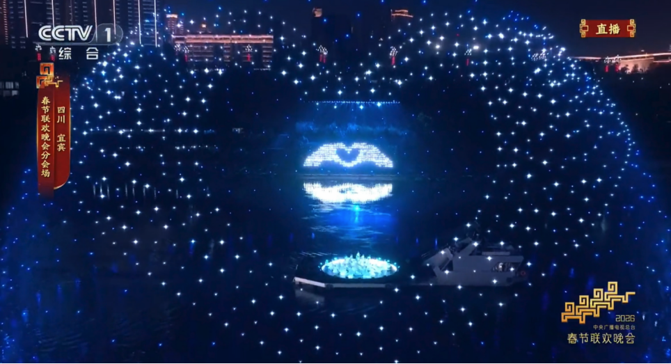 在春晚宜宾分会场上,来自中国航空工业集团的无人机——“云影”“翼龙”先后在低空现身,送上了来自云端的新春祝福。其间,10架“云影”在成飞“文鳐”智慧管控系统操作下,垂直升空改平飞,如繁星点点铺展于夜幕之上;2架“翼龙”也如期赴约,绘就着温暖祝福。