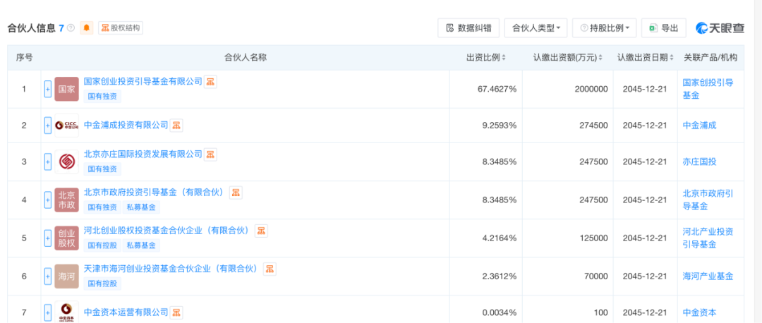 据工商注册信息,京津冀创投引导基金的出资额为296.46亿元,共有7家合伙人。其中,国家创投引导基金出资200亿元、控股67.46%,中金浦成投资有限公司出资27.45亿元,亦庄投资、北京引导基金各出资24.75亿元,河北创业股权投资基金合伙企业(有限合伙)出资12.5亿元,天津市海河创业投资基金合伙企业(有限合伙)出资7亿元,中金资本出资100万元。