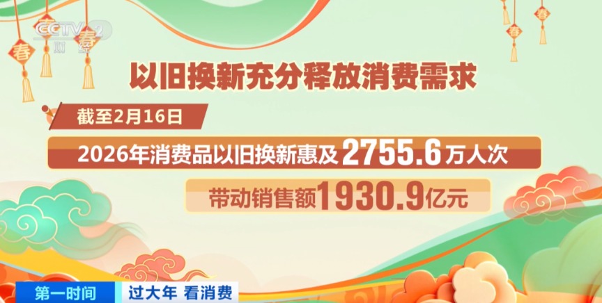 以旧换新充分释放消费需求。截至2月16日,2026年消费品以旧换新惠及2755.6万人次,带动销售额1930.9亿元。其中,汽车以旧换新60.7万辆,带动新车销售额995.6亿元。