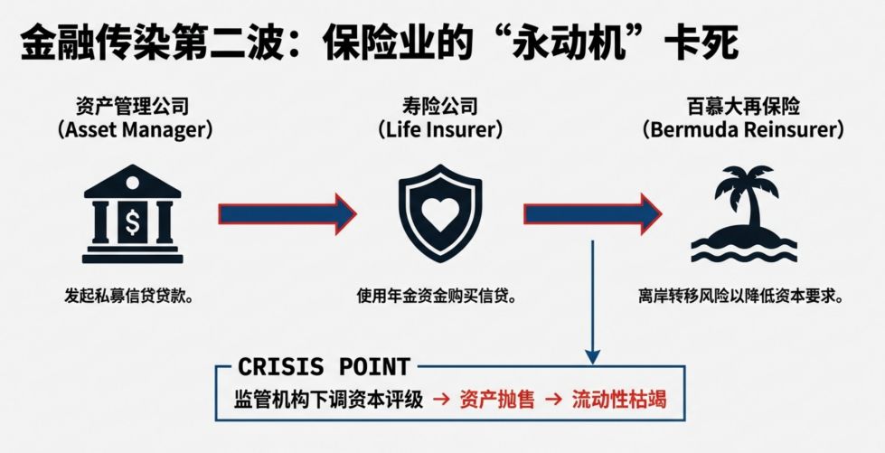 报告还指出,金融传染会从私募信贷向保险、资管行业扩散。资产管理公司、寿险公司、再保险公司构成的信贷链条,会因监管下调资本评级引发资产抛售、流动性枯竭。