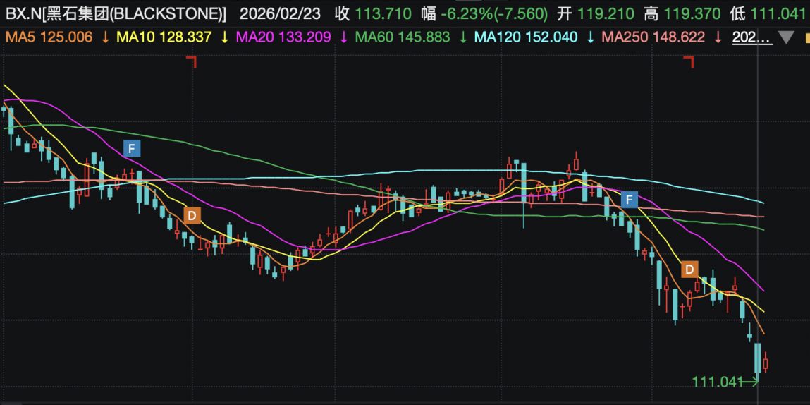 消息传出后迅速引发连锁反应,拖累资管板块集体下跌。2月19日,黑石、阿波罗全球管理等机构股价应声下跌超5%,KKR、Ares等同行也纷纷走弱。