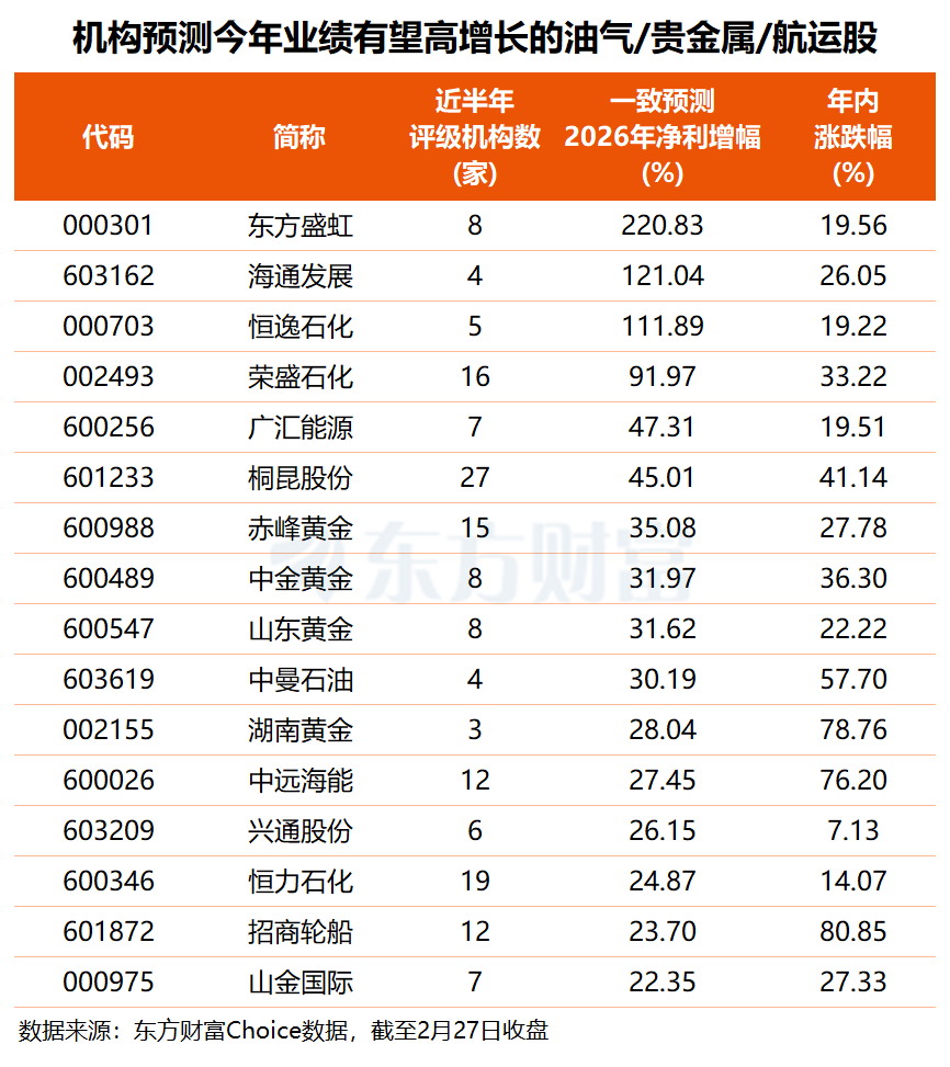 具体而言,机构预测东方盛虹今年净利或同比大增约221%,海通发展、恒逸石化均有望实现业绩翻倍增长,荣盛石化的预测归母净利润增长率也高达约92%,广汇能源、桐昆股份、赤峰黄金、中金黄金、山东黄金、中曼石油等6股净利增幅均有望超三成。