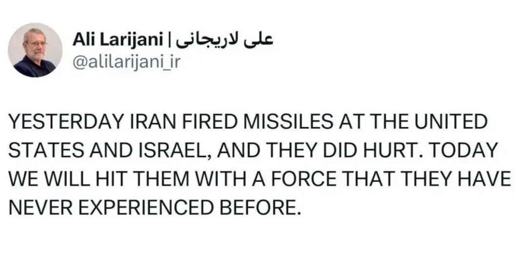 据央视新闻报道,伊朗最高国家安全委员会秘书拉里贾尼发文称,昨天,伊朗向美国和以色列发射了导弹,他们确实感到疼痛。今天,他们将遭受“从未感受过的打击”。
