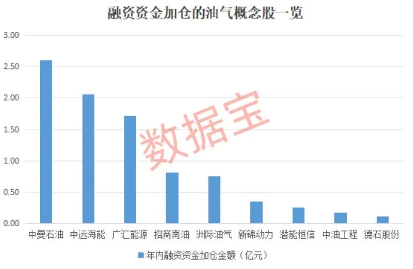从资金加仓来看,年内9只油气开采概念股获融资资金加仓,中曼石油、中远海能、广汇能源加仓金额最高,分别为2.61亿元、2.05亿元、1.71亿元,招商南油、洲际油气、新锦动力加仓金额均在3000万元以上。