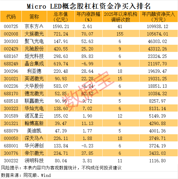 杠杠资金加仓、机构关注度较高的潜力股未来能否跑赢市场?数据显示,2025年以来获超5次机构调研同时2026年以来获得杠杠资金净买入概念股合计有19只。其中,京东方A和大族激光均吸金超10亿元,聚飞光电、兆驰股份、炬光科技等个股吸金超过1亿元。
