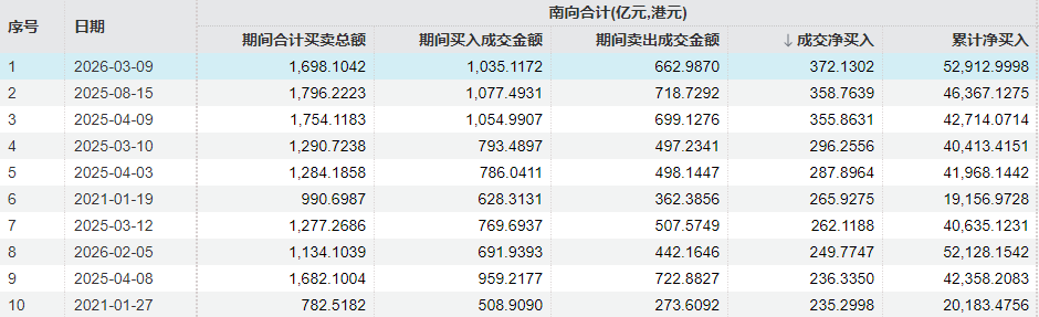 3月9日,港股市场波动剧烈,恒生指数一度重挫逾3%,但午后跌幅明显收窄,截至收盘时跌1.35%。南向资金净买额达372.13亿港元,创历史最高单日净买入纪录。此前南向资金单日净买入纪录为2025年8月15日的358.76亿港元。