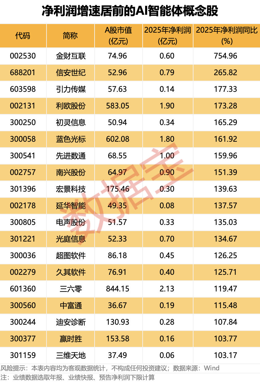 据数据宝统计,按照已披露的年报、业绩快报、预告净利润下限(若无下限则取公告数值)计算,2025年净利润同比增长20%以上(含扭亏为盈)的AI智能体概念股有28只。业绩预计扭亏的概念股包括金财互联、信安世纪、引力传媒、三六零、赢时胜、迪安诊断、蓝色光标、利欧股份等。