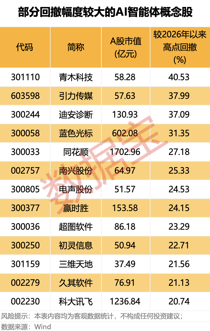 据数据宝统计,从股价表现来看,截至3月9日收盘,上述业绩高增长的28只AI智能体概念股中,收盘价较2026年以来高点回撤20%以上的有13只。青木科技、引力传媒、迪安诊断、蓝色光标、同花顺等回撤幅度靠前。