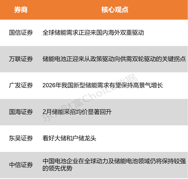 国信证券表示,全球储能需求正迎来国内海外双重驱动,国内容量电价政策落地激发市场化订单爆发;美国因数据中心负荷激增导致电力供应短缺,推动大储装机提速。万联证券指出,“发展新型储能”正式写入《政府工作报告》,政策定调清晰、市场化机制完善,储能电池作为核心载体,正迎来从政策驱动向供需双轮驱动的关键拐点。