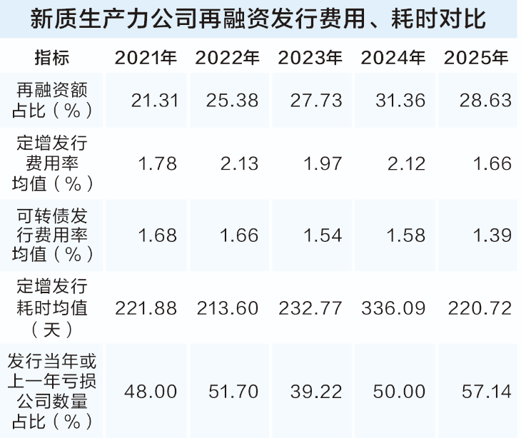 四是业绩包容性提升。2025年,实施再融资的新质生产力相关公司中,发行当年或上一年净利润亏损的公司数量占比出现提升,超过57%,创过去5年最高水平。2024年及2025年开展再融资的科创板公司,发行当年或上一年净利润亏损的公司数量占比均超过54%,充分体现了政策对科技创新企业业绩的包容性。
