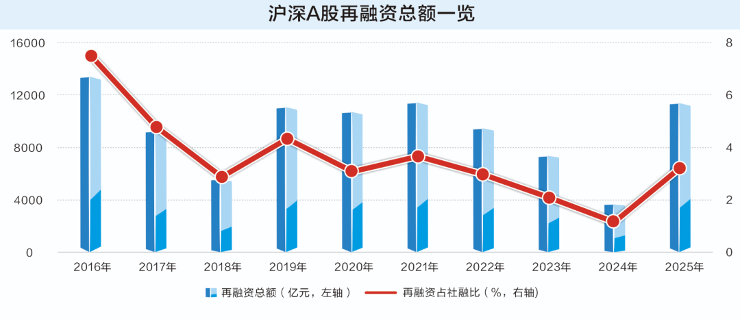 从数据走势看,再融资规模从2025年以来出现明显提升。国家统计局数据显示,“十四五”时期,A股再融资(增发、配股、优先股、可转债转股)市场呈“V”型走势。2024年,沪深A股再融资总额降至过去十年冰点。
