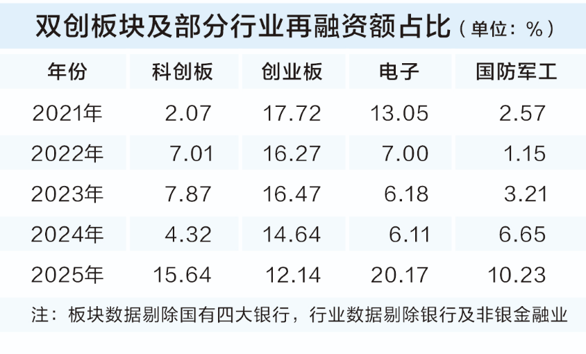 从融资结构来看,2025年主板再融资额占比超过87%,“双创”(科创板、创业板)板块再融资额占比12.59%。若剔除国有四大银行合计5200亿元的大额再融资后,“双创”板块再融资规模占比接近28%,创过去十年最高水平,其中科创板再融资规模占比同样创历史新高,超过15%。