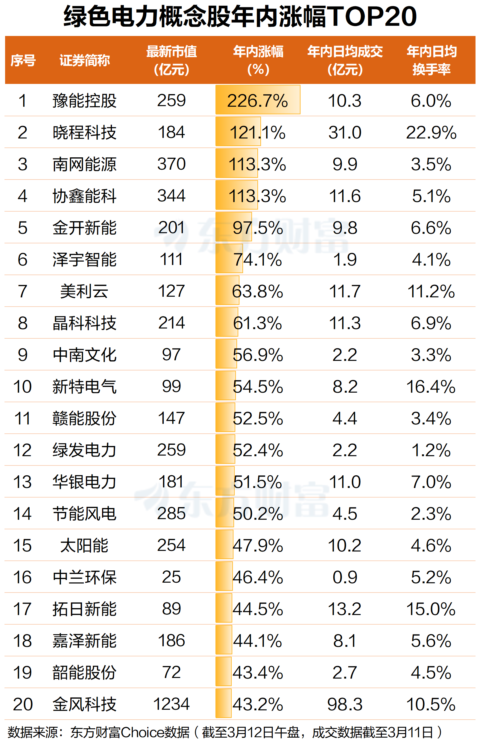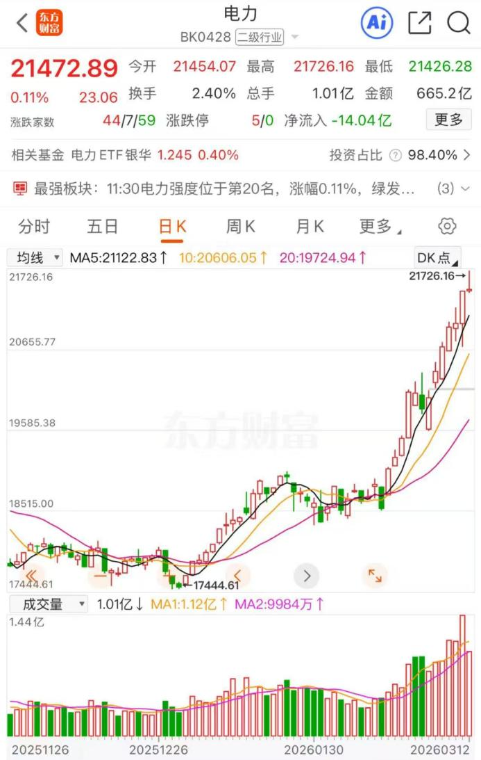3月12日早盘,A股三大指数集体调整,截至早间收盘,板块多数下跌,电力行业逆势上涨0.11%,日K线暂报“七连阳”。个股方面,大唐发电、绿色动力、绿发电力、中南文化、节能风电、梅雁吉祥涨停,协鑫能科涨超9%,新天绿能、上海能源、建投能源、泽宇智能、百通能源等涨超4%。