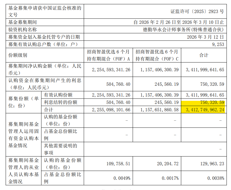 3月13日,招商基金发布公告称,招商智盈优选6个月持有期(FOF)基金合同于2026年3月12日正式生效。该产品募集期为2026年2月26日至3月10日,净认购总额为34.12亿元,其中A类22.55亿元、C类11.57亿元;有效认购户数9253户。托管行为中国银行。