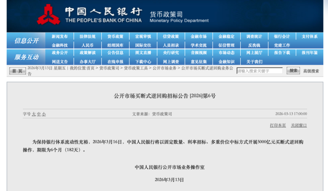 3月13日,央行发布消息称,为保持银行体系流动性充裕,2026年3月16日,中国人民银行将以固定数量、利率招标、多重价位中标方式开展5000亿元买断式逆回购操作,期限为6个月(182天)。