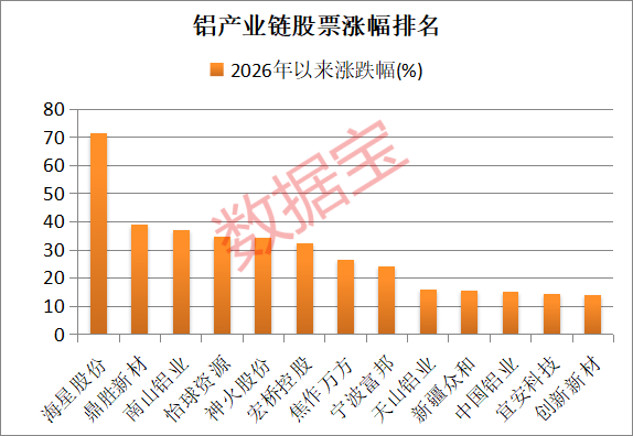 A股市场铝产业链股票合计31只,截至3月13日收盘,股票合计A股市值为1.24万亿元。据证券时报•数据宝统计,今年以来,铝产业链股票平均上涨13.58%,跑赢同期上证指数10个百分点以上。海星股份、鼎胜新材、南山铝业、怡球资源、神火股份、宏桥控股6股累计涨幅均超30%。