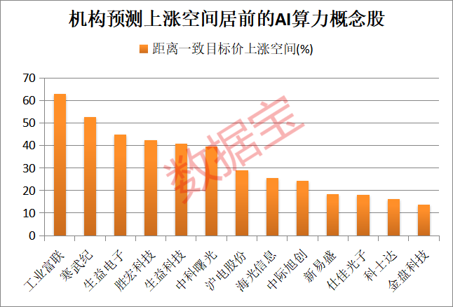 二级市场表现来看,上述31只AI算力概念股中已诞生多只翻倍大牛股,未来股价是否还有上行空间?机构的研报或能提供一定参考。据数据宝统计,根据5家以上机构一致预测,以3月16日收盘价与机构一致预测目标价相比,13股上涨空间达到10%以上,如工业富联、寒武纪、生益电子、胜宏科技、生益科技等。