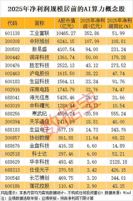 14只概念股净利润达到11亿元以上,如工业富联、中际旭创、新易盛、润泽科技、胜宏科技等。