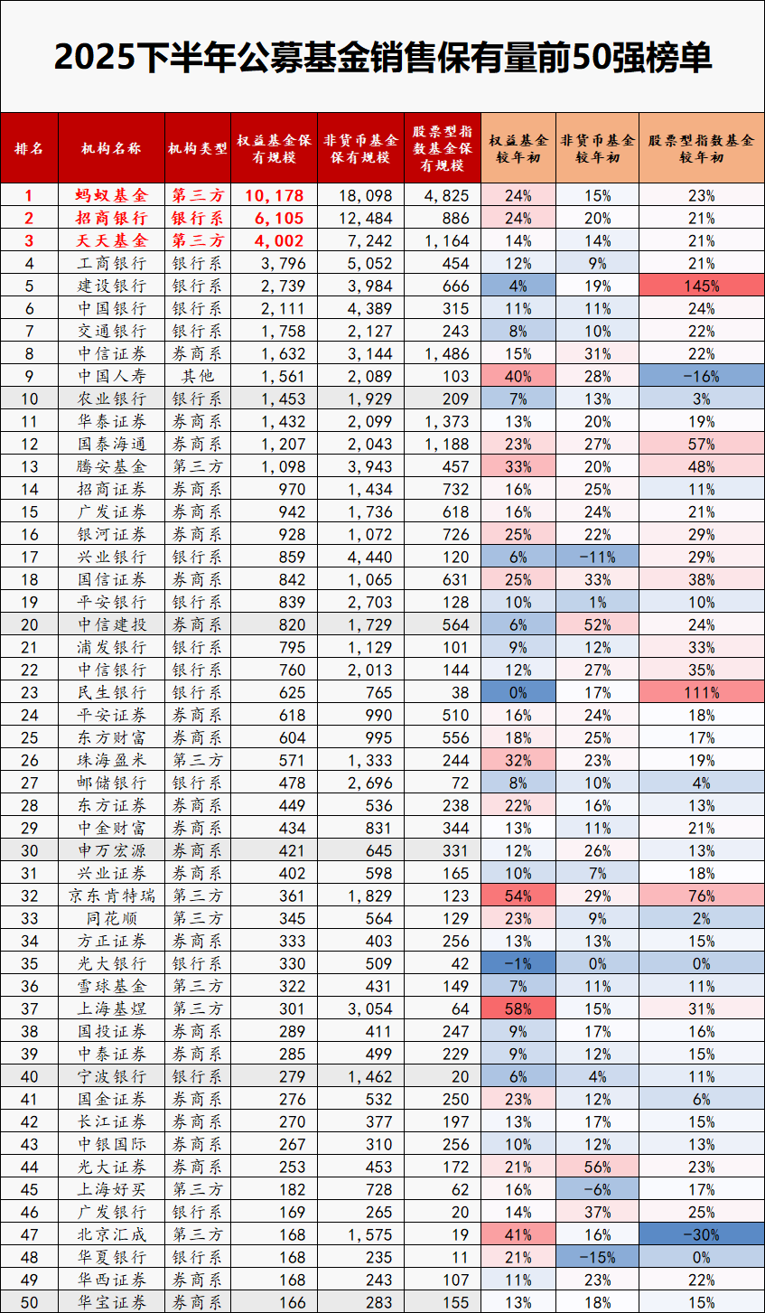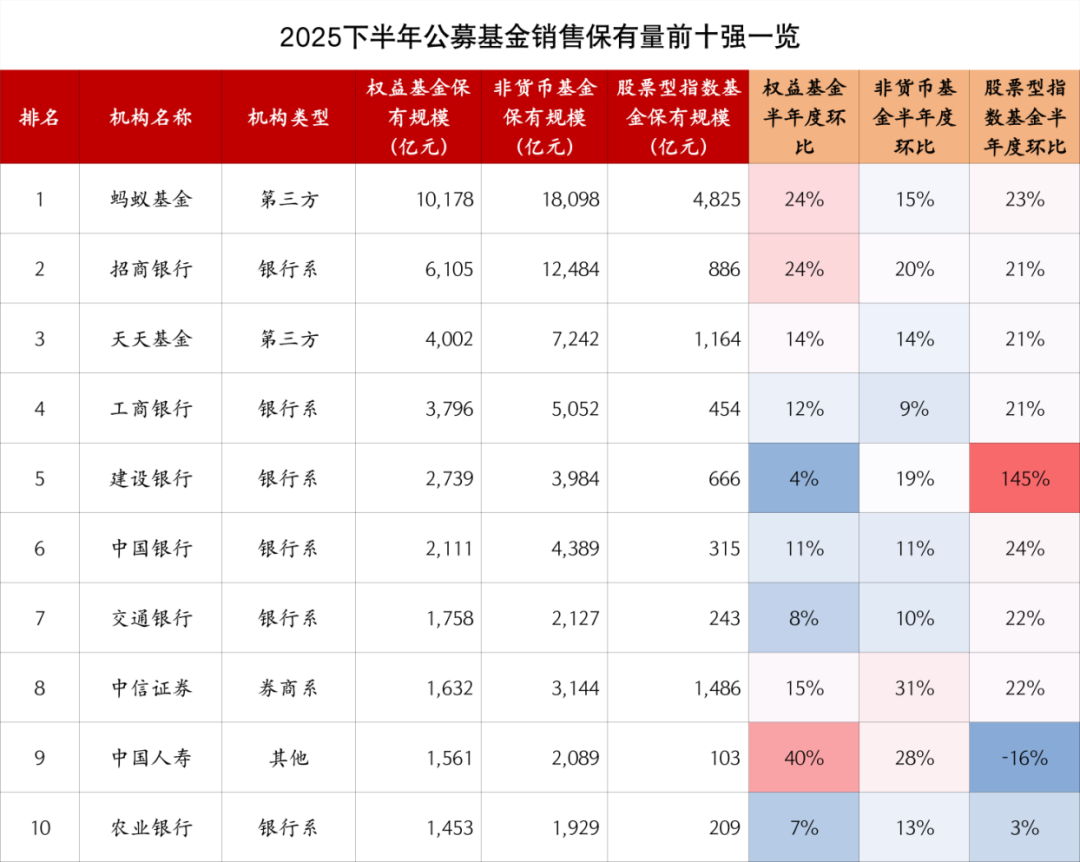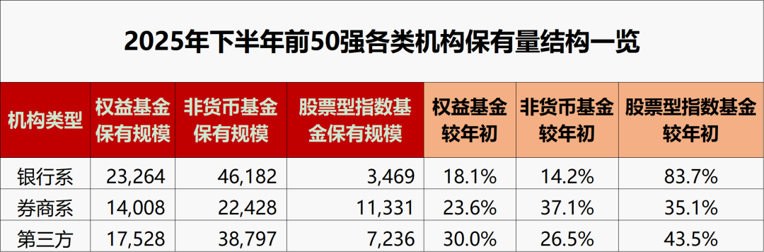 最新公募基金保有量数据显示,2025年下半年,公募基金权益产品保有量前十强座次生变,中国人寿跻身前十;蚂蚁基金作为头部机构渠道优势突出,权益类基金保有规模突破万亿元关口;券商系受益于较高风险偏好客群,ETF保有规模、市占率最高;银行系机构的股票指数基金保有规模激增34.2%,延续大幅增长,彰显了股票指数基金在银行端的销售优势。