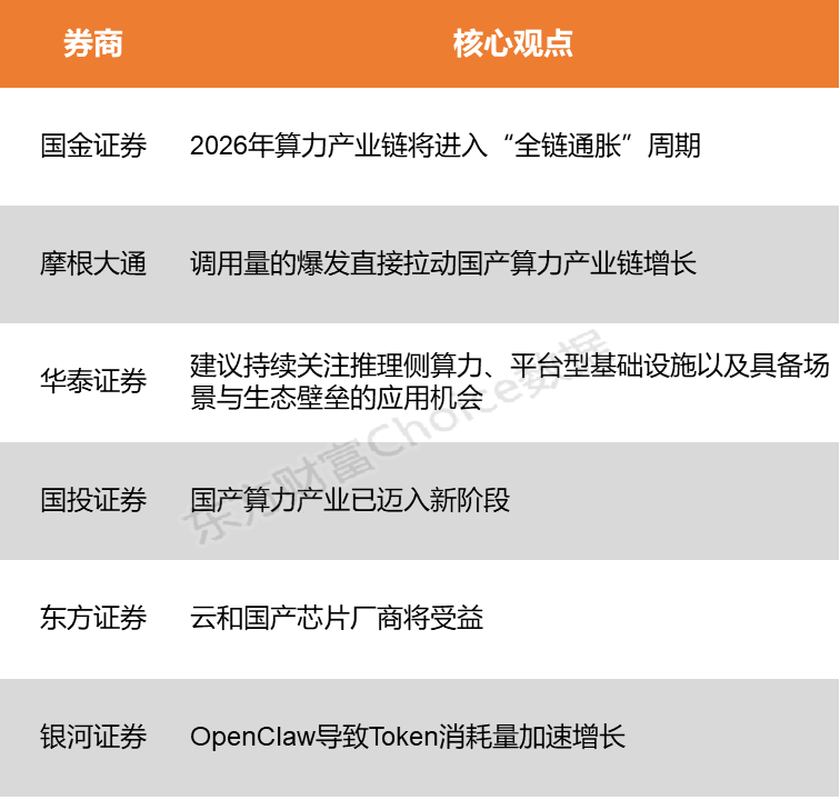 国金证券表示,在供需双侧强逻辑的挤压下,预判2026年算力产业链将进入“全链通胀”周期,行业景气度将从核心芯片向AIDC、云与算力服务、配套电力设备及服务器等环节全面外溢。摩根大通指出,调用量的爆发直接拉动国产算力产业链增长。从AI芯片、服务器到数据中心、云计算,均迎来业绩爆发期。