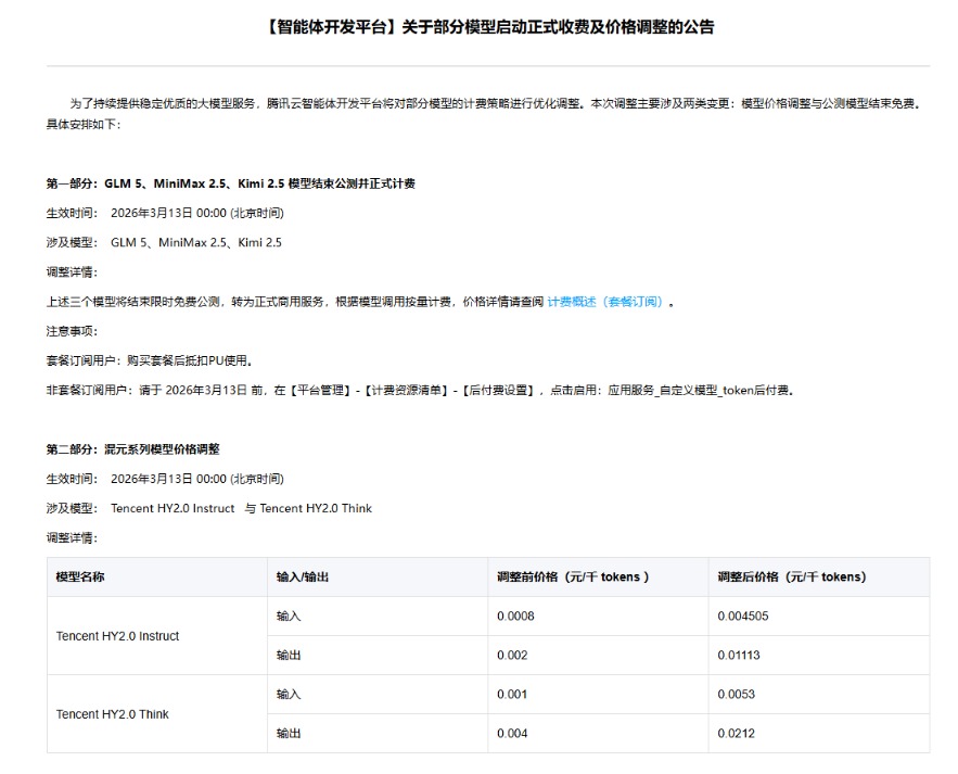 就在一周前,腾讯云宣布,3月13日起,GLM 5、MiniMax 2.5、Kimi 2.5模型结束公测并正式计费;混元系列模型价格上调。