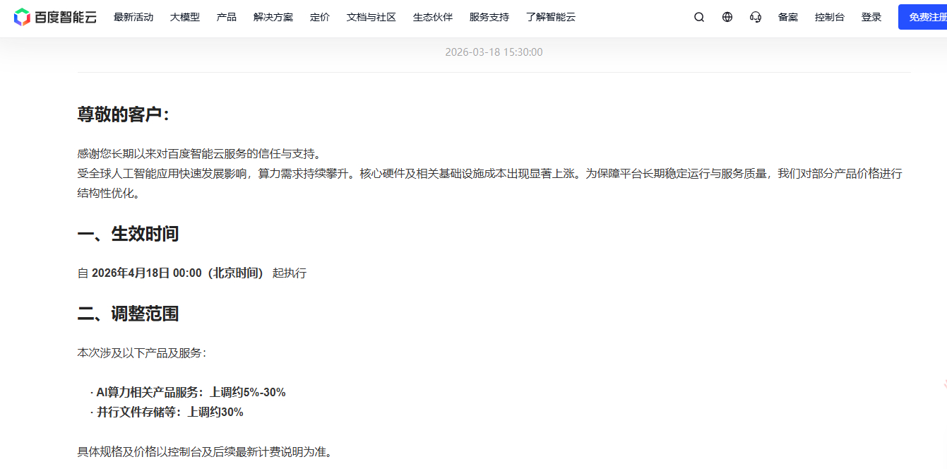 18日下午,百度智能云宣布,自2026年4月18日起,AI算力相关产品服务价格上调约5%-30%;并行文件存储等价格上调约30%。