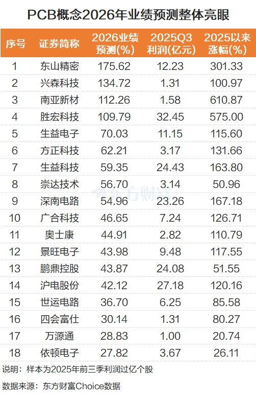 东山精密排在首位,预计2026年业绩同比增长175.62%。兴森科技、南亚新材、胜宏科技业绩预测也翻倍,同比增幅分别为134.72%、112.26%、109.79%。