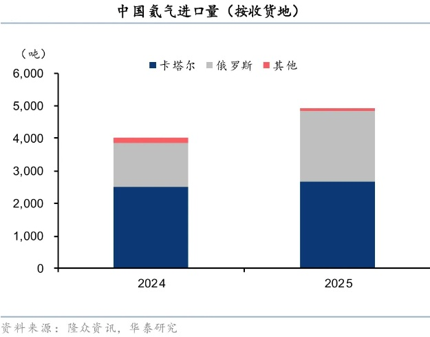 之所以氦气受到市场的较多关注,在于卡塔尔这两年是我国氦气的第一大供应国。华泰证券研报显示,2025年我国进口氦气中66%源于卡塔尔。
