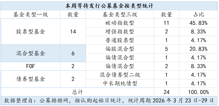 3月23日,公募排排网数据显示,按认购起始日统计,2026年3月23日至29日当周,全市场仅有24只新基金等待发行,已连续两周低于30只,明显低于春节后周度常规发行水平。
