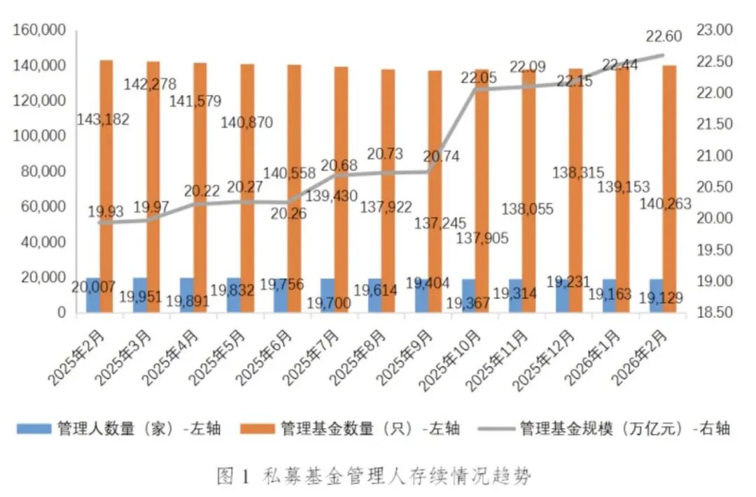 3月24日,中国证券投资基金业协会发布的私募基金管理人登记及产品备案月报显示,截至2026年2月末,存续私募基金管理人达19129家;管理基金数量为140263只,管理基金规模达到22.60万亿元,较上月末增长1600亿元,再创历史新高。
