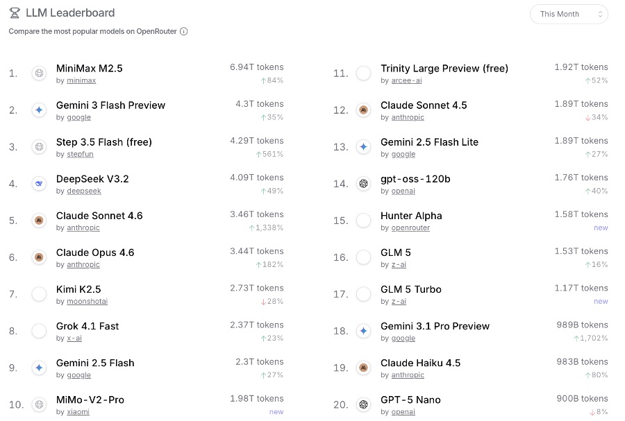 中国成为“赢家”之一。据OpenRouter最新数据显示,在本月(3月1日—23日)的单模型热度榜单中,小米、DeepSeek、阶跃星辰、月之暗面、智谱等中国厂商集体入选前十名,Minimax更是登顶调用量第一。此前据央视报道,截至3月15日,OpenRouter显示中国AI大模型的周调用量达到4.69万亿Token,连续第二周超越美国。