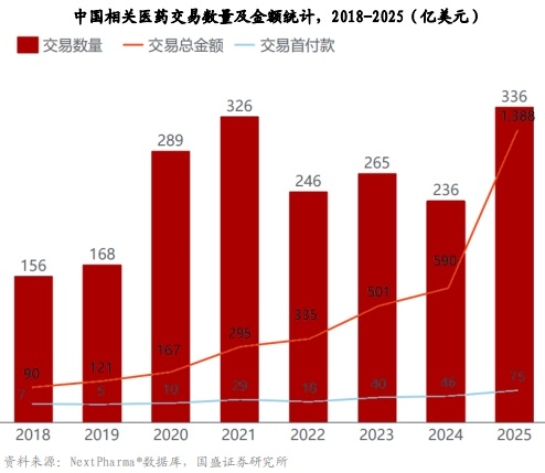 据国盛证券统计,我国创新药BD交易正呈爆发式增长。2025年创新药BD交易总金额提升至1388亿美元(+135%),首付款增至75亿美元(+63%);2025年中国相关交易总金额约占全球交易总金额50%。