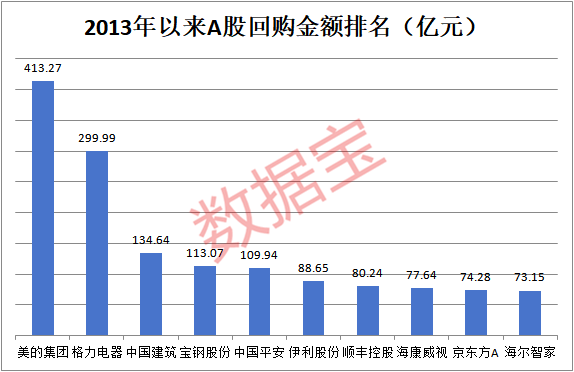 美的集团是A股市场知名的“回购王”。2013年以来,公司累计回购金额高达413亿元,高居A股第一。排名第二的是格力电器,2013年以来累计回购近300亿元。此外,中国建筑、宝钢股份、中国平安等个股回购均超百亿元。