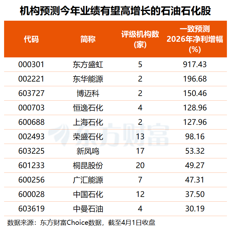 未来增长潜力方面,根据2家及以上机构预测,东方盛虹2026年净利有望同比大增逾9倍,东华能源、博迈科、恒逸石化、上海石化等4股今年业绩均有望翻倍增长,荣盛石化预测净利增幅也接近1倍,新凤鸣、桐昆股份、广汇能源均有望实现五成左右业绩增长。