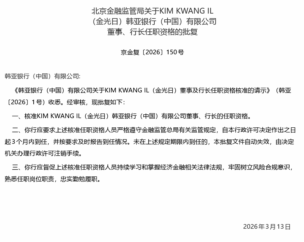 国家金融监督管理总局北京监管局官网3月20日信息显示,该局于2026年3月13日作出批复,核准KIM KWANG IL(金光日)担任韩亚中国董事、行长的任职资格。批复要求其在行政许可决定作出之日起3个月内到任。
