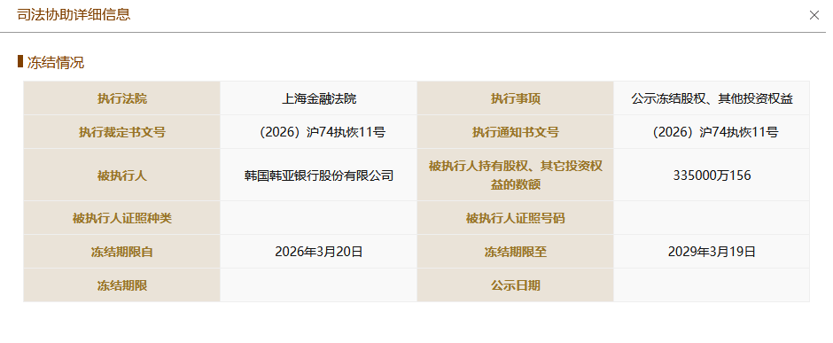 相关信息显示,被执行人为韩国韩亚银行股份有限公司(以下简称“韩亚银行”),冻结股权数额为33.5亿元,冻结期限自2026年3月20日至2029年3月19日,执行法院为上海金融法院。