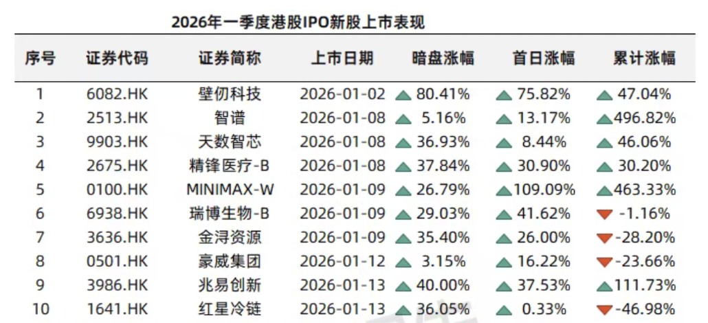 半导体赛道迎来上市潮,壁仞科技、天数智芯、豪威集团、兆易创新、澜起科技等企业集中亮相,覆盖AI芯片、内存接口芯片、图像传感器等关键环节;人工智能领域迎来明星企业扎堆上市,智谱、MINIMAX两大AI大模型龙头备受资本追捧,上市后二级市场表现一骑绝尘;工业机器人赛道同样热度不减,华沿机器人、埃斯顿、大族数控等企业陆续登陆港股。