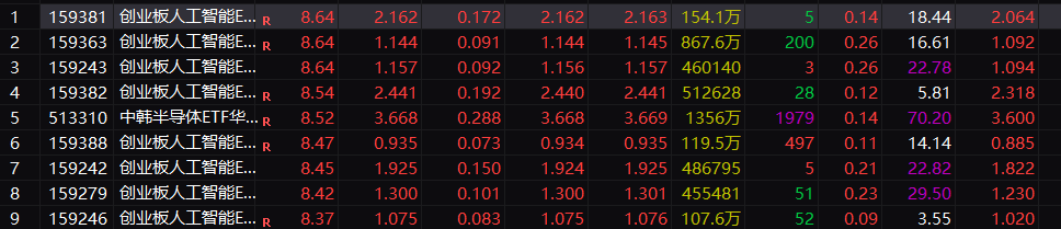 具体来看人工智能板块的热度。今日午后,人工智能ETF涨幅多数超过8%。科创50指数涨幅扩大至6%,成份股全部上涨。这似乎对应着整个赛道人气的强势回归。