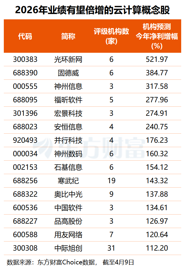 未来增长潜力方面,根据3家及以上机构一致预测,共30只云计算概念股今年业绩有望增逾五成,其中,机构预计光环新网今年净利将同比大增522%,固德威、宏景科技等5股均有望实现2倍以上净利增长,石基信息、寒武纪、用友网络、中际旭创等9股预测净利增幅均在110%以上。