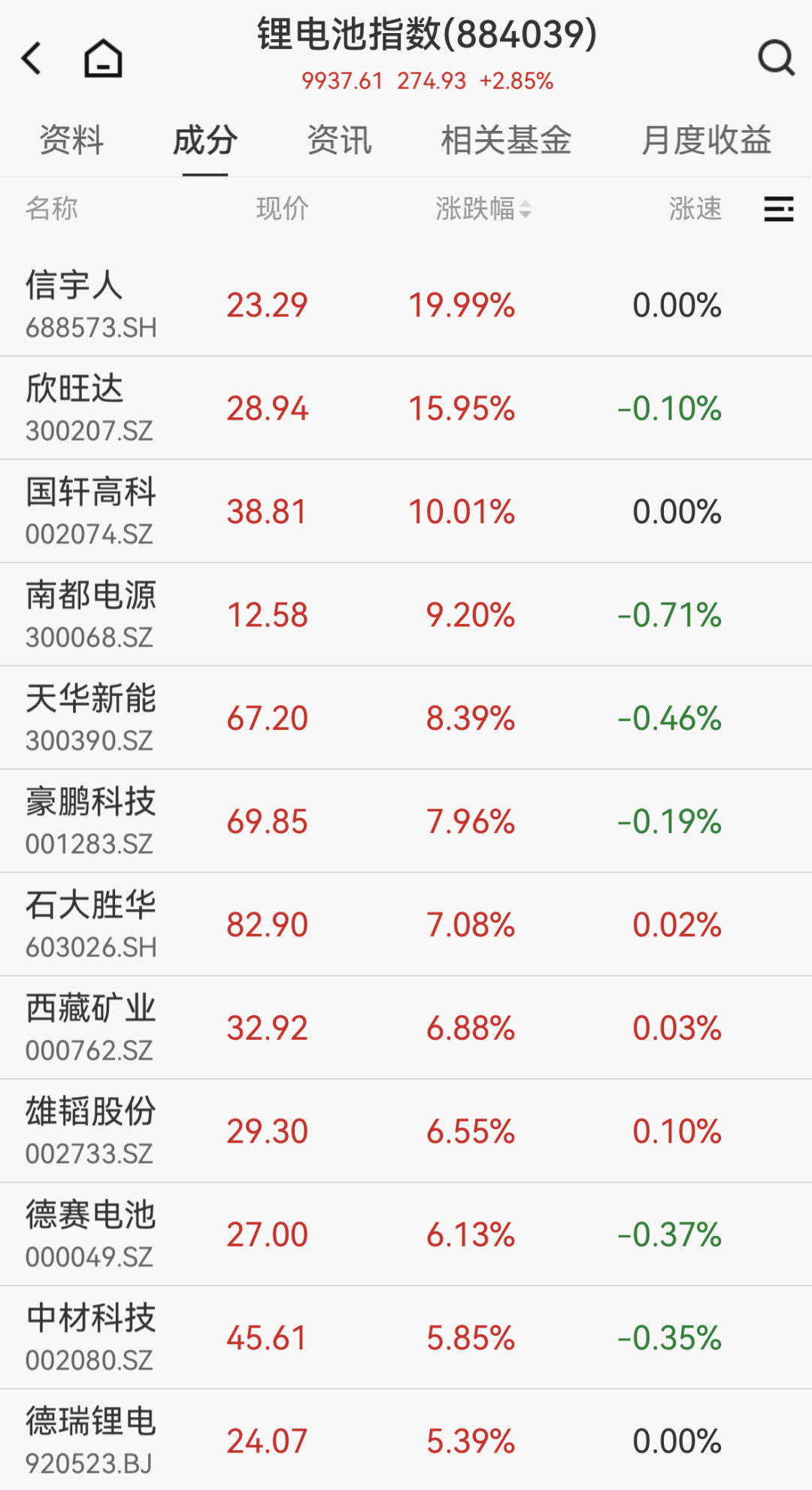 早盘锂电池全产业链走高,概念指数最高上涨4.78%,午间休市涨2.85%,信宇人“20cm”涨停,国轩高科涨停,欣旺达上涨15.95%,南都电源、天华新能、豪鹏科技、石大胜华均涨超7%。