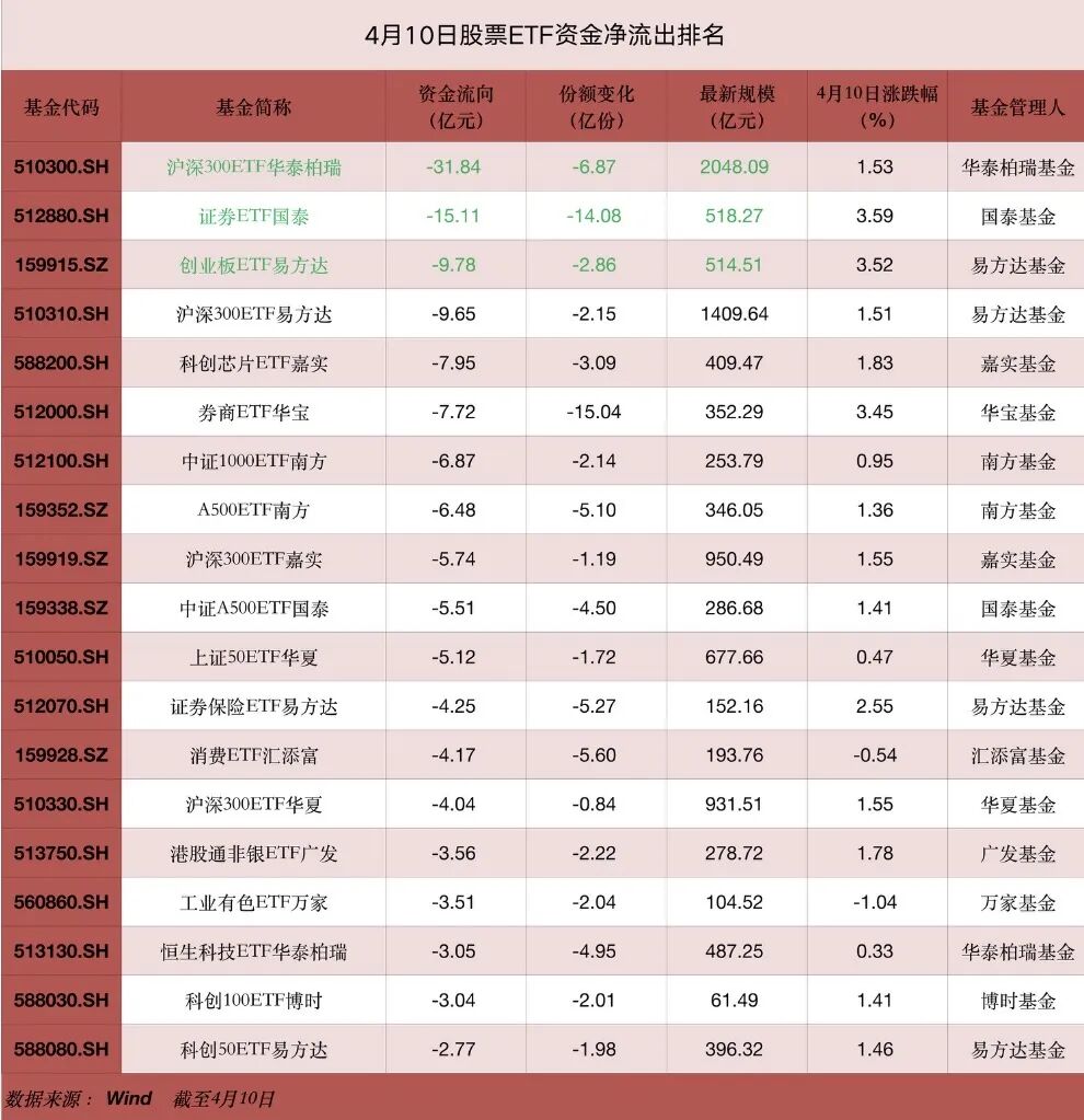 Wind数据显示,截至4月10日,全市场1380只股票ETF(含跨境ETF)总规模达3.86万亿元,当日股票ETF资金整体净流出231.9亿元,而商品ETF与债券ETF净流入居前,分别为4.87亿元与3.33亿元。