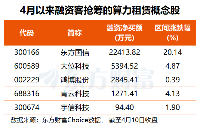 4月以来,大部分算力租赁概念股股价均有所上行,东方国信月内上涨20.14%居首,利通电子、亿田智能均实现两位数涨幅。