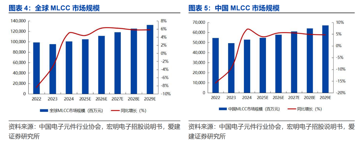 据中国电子元件行业协会预测,2025年受益于AI服务器需求放量、车规级MLCC需求持续增加,全球MLCC市场规模或将达到1050.43亿元,同比增长4.4%;到2029年全球MLCC市场规模将升至1326.2亿元,2025-2029年间的复合增长率约为6.0%。