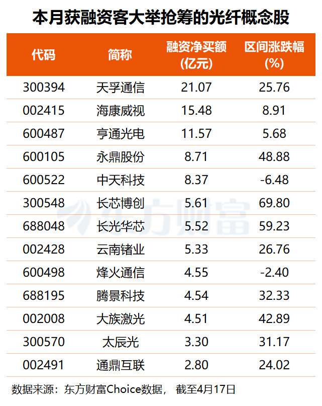 进入4月以来,约85%的光纤概念股股价走高,长芯博创大涨近七成,蘅东光、长光华芯以约六成涨幅位居二三位,仕佳光子、永鼎股份、源杰科技、大族激光、光库科技月内涨幅均在40%以上。