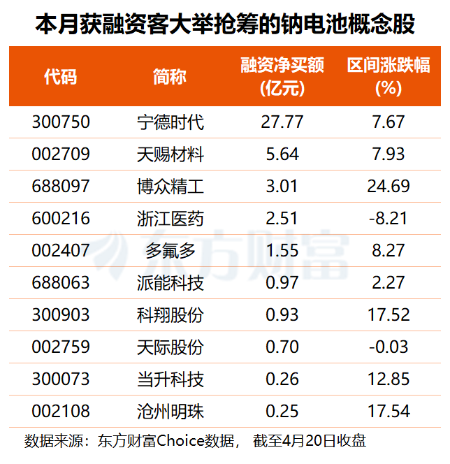 4月至今,多达约八成钠电池概念股录得股价上行,八连板牛股圣阳股份大涨87.39%居首,维科技术、高乐股份均涨逾三成,万润新能、雄韬股份、博众精工、传艺科技、电科蓝天区间涨幅均在20%以上。