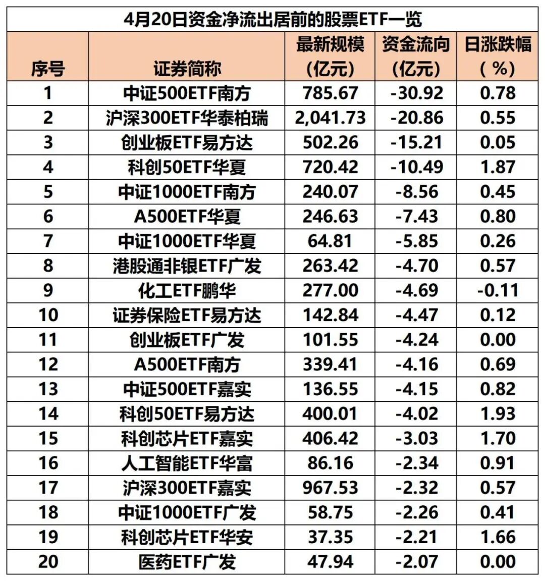 4月20日,沪指放量上涨逼近4100点,航天装备、航海装备、稀土、互联网电商等板块涨幅居前。与此同时,全市场股票ETF(含跨境ETF)资金净流出达135.6亿元。
