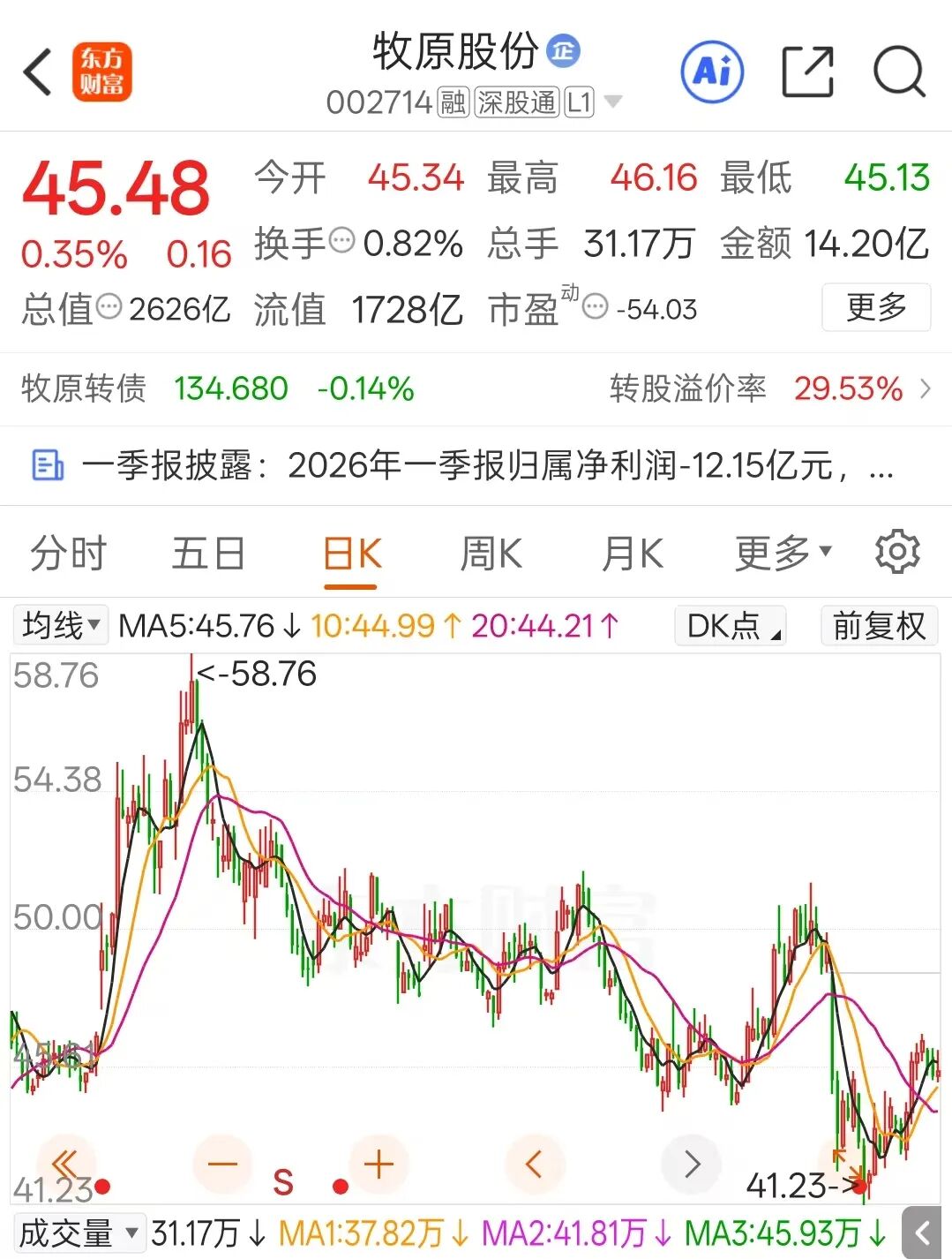 股价表现方面,4月21日,牧原股份收涨0.35%,报45.48元/股,总市值2626亿元。