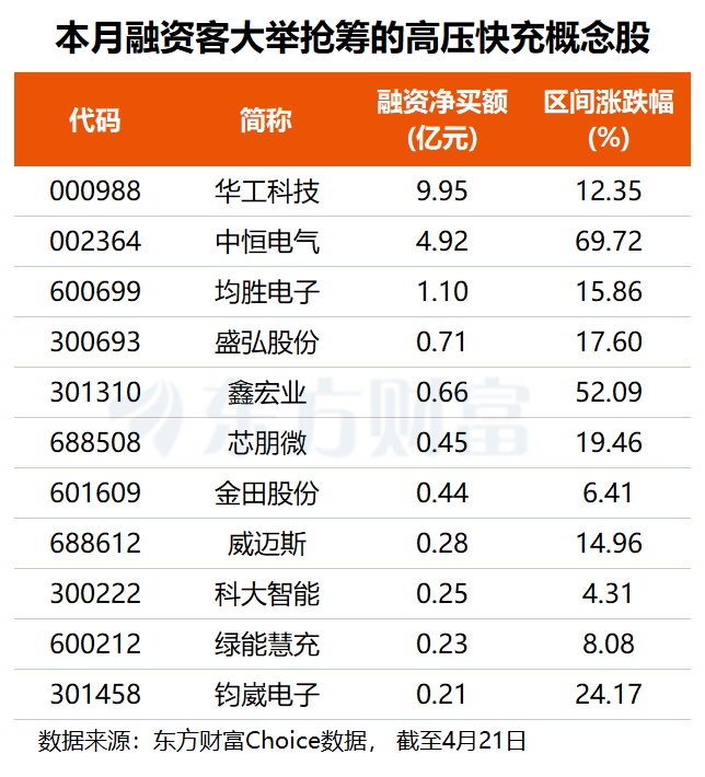 4月以来,高压快充概念走势较好,八成个股股价上行,中恒电气月内大涨69.72%居首,鑫宏业涨超五成位居次席,胜蓝股份、永贵电器、钧崴电子、华自科技区间涨幅均在23%至28%之间。