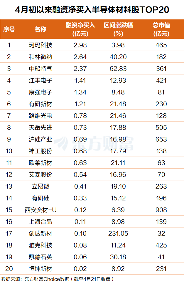 中船特气、江丰电子、康强电子、有研新材、路维光电、天岳先进、沪硅产业、神工股份、欧莱新材等个股融资净买额在2.4亿元至6000万元之间不等。